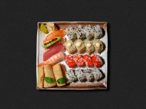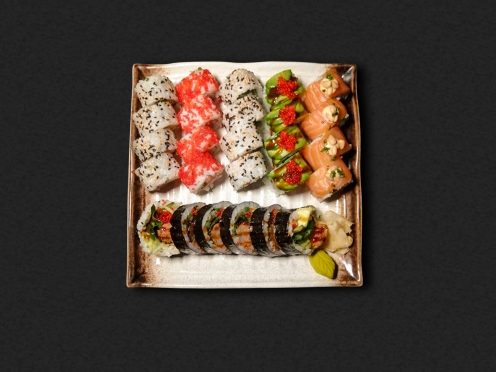 4 uramaki California, 4 uramaki Hawaiian, 4 uramaki Alaska, 4 uramaki Honolulu, 1 nigiri Laks, 1 nigiri Flamberet laks, 1 nigiri Tun, 1 nigiri Reje, 6 Miniforårsruller Gælder indtil kl. 16.00