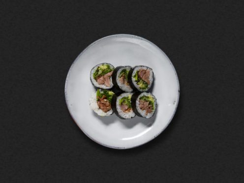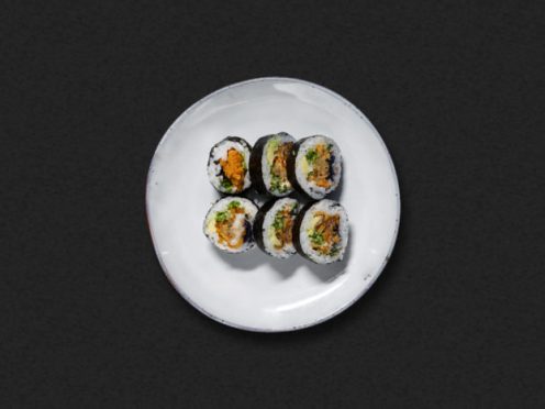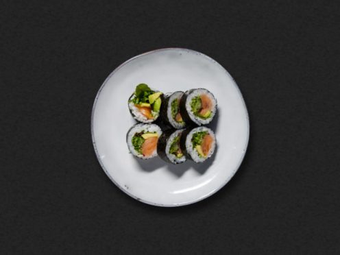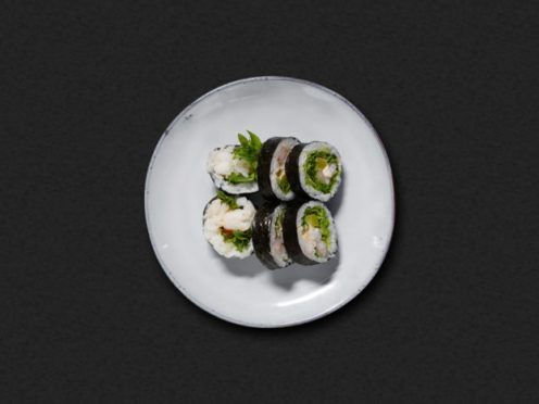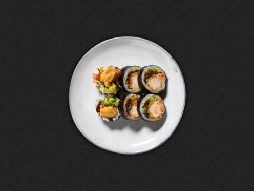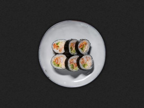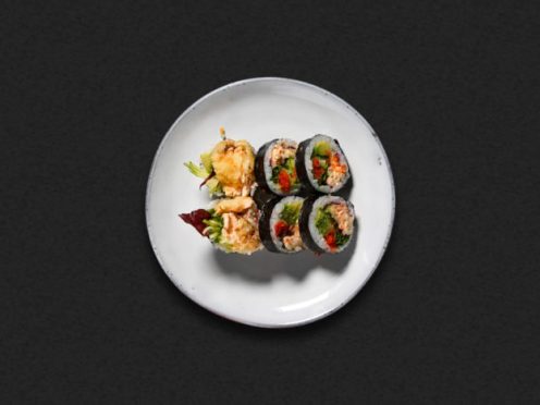 Tempura krabbekød, avocado, agurk, purløg, sesam, chilimayo, dansk kaviar, teriyaki sauce
