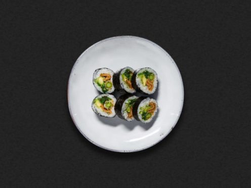 Indbagt asparges, inari, avocado, agurk, tangsalat, cashewnødder