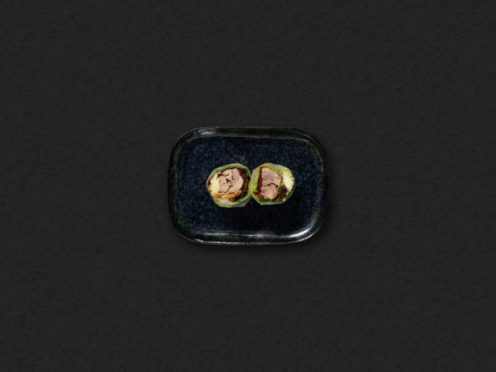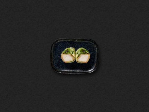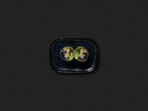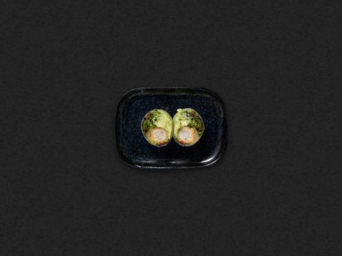 Indbagte tigerrejer, agurk, avocado, sesam, tobiko, purløg, mix salat, teriyaki sauce