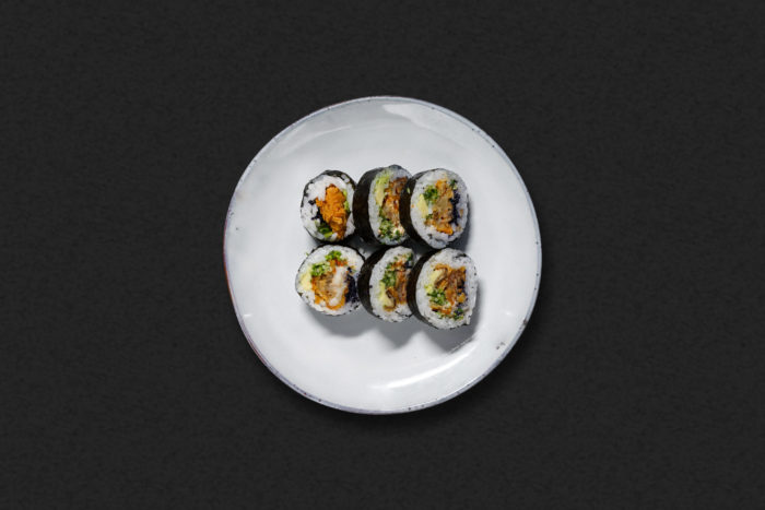 Tempura krabbekød, avocado, agurk, purløg, sesam, chilimayo, dansk kaviar, teriyaki sauce