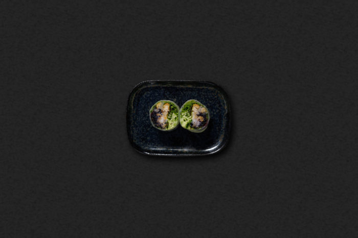 Tempura krabbekød, agurk, avocado, mix salat, dansk kaviar, teriyaki sauce