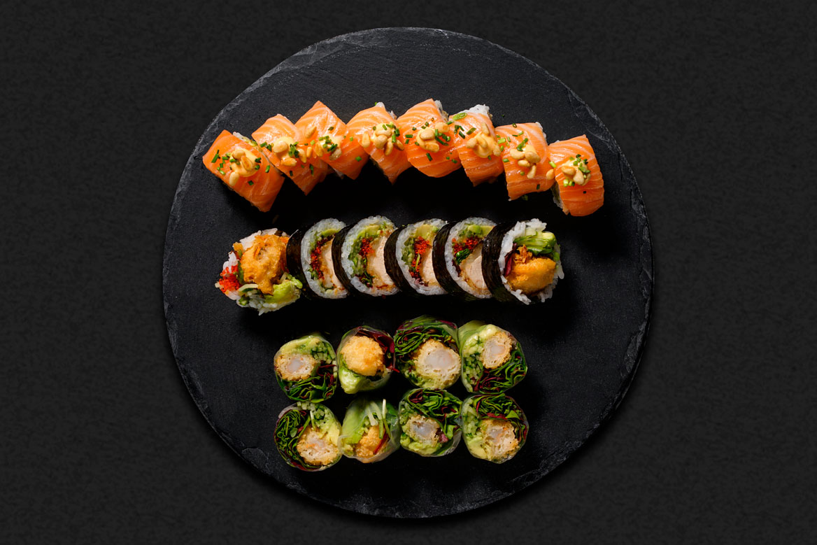 8 Sparkling Salmon, 8 Shrimp Rispapir, 6 Futomaki Crispy Chicken