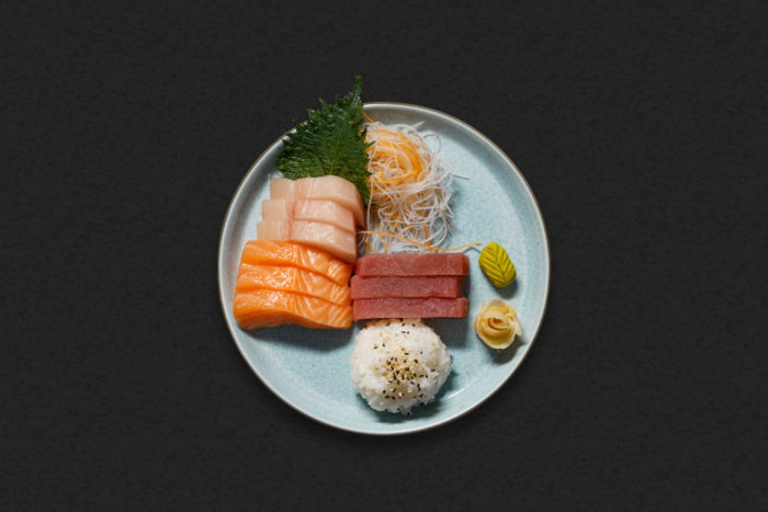 3 tykke skiver laks, 3 tykke skiver tun, 3 tykke skiver hamachi, serveret med ris og salat