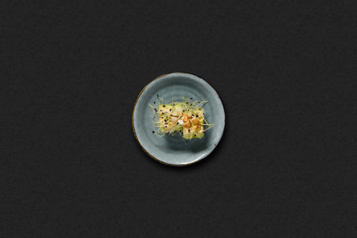 Indbagte tigerrejer, blomkål, æble, toppet med avocado, persillemayo, cashewnødder og rødbedespirer