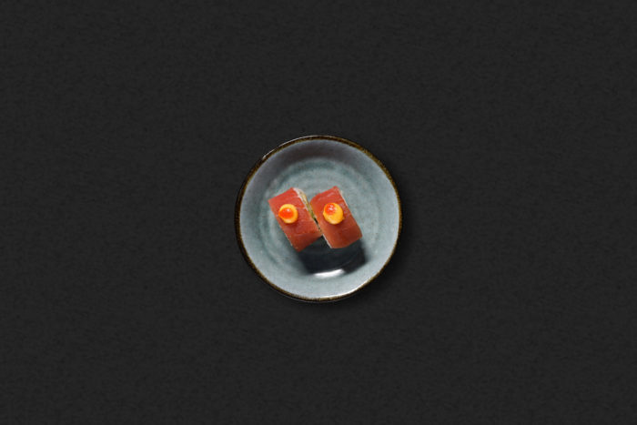 Indbagte tigerrejer, avocado, agurk, toppet med tun, chilimayo, sriracha