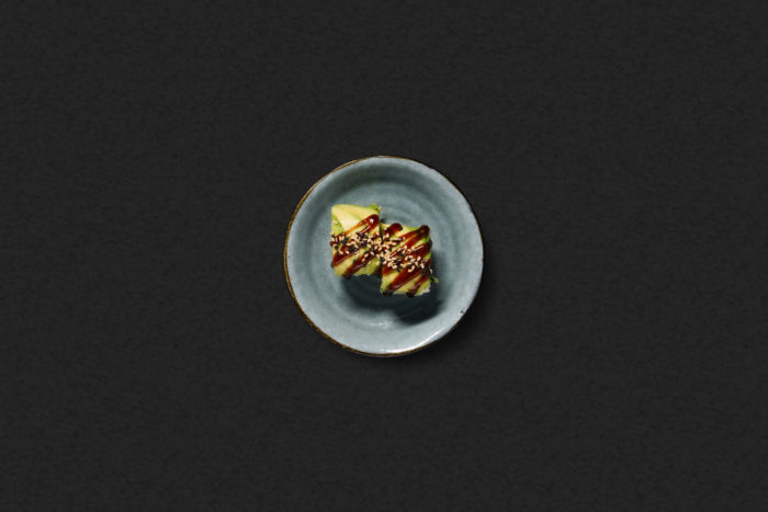 Grillet havål, avocado, agurk, toppet med avocado, teriyaki sauce og sesam