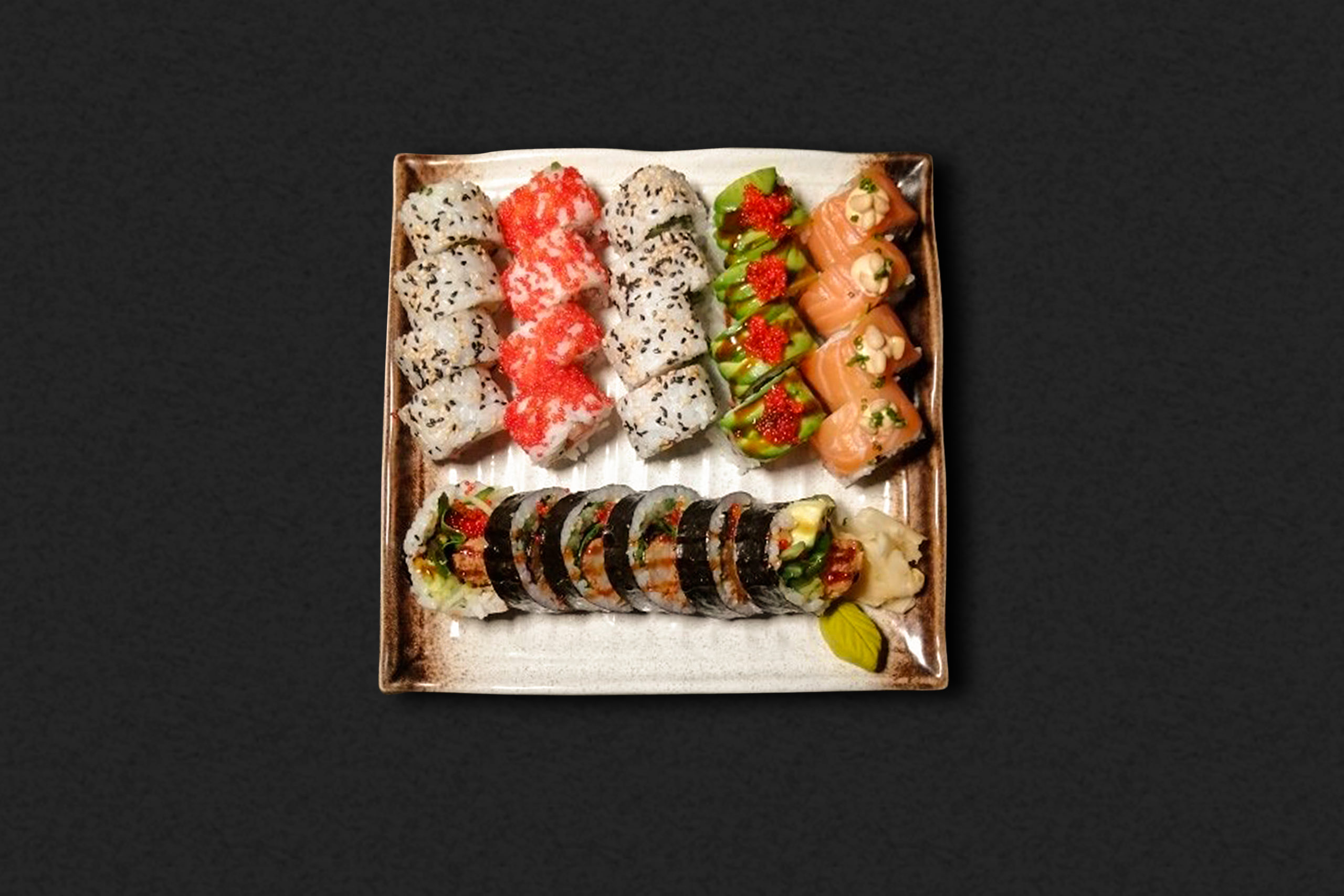 4 uramaki California, 4 uramaki Hawaiian, 4 uramaki Alaska, 4 kaburimaki Sparkling Salmon, 4 kaburimaki Crispy Deluxe, 6 futomaki Ebi Tempura Gælder indtil kl. 16.00