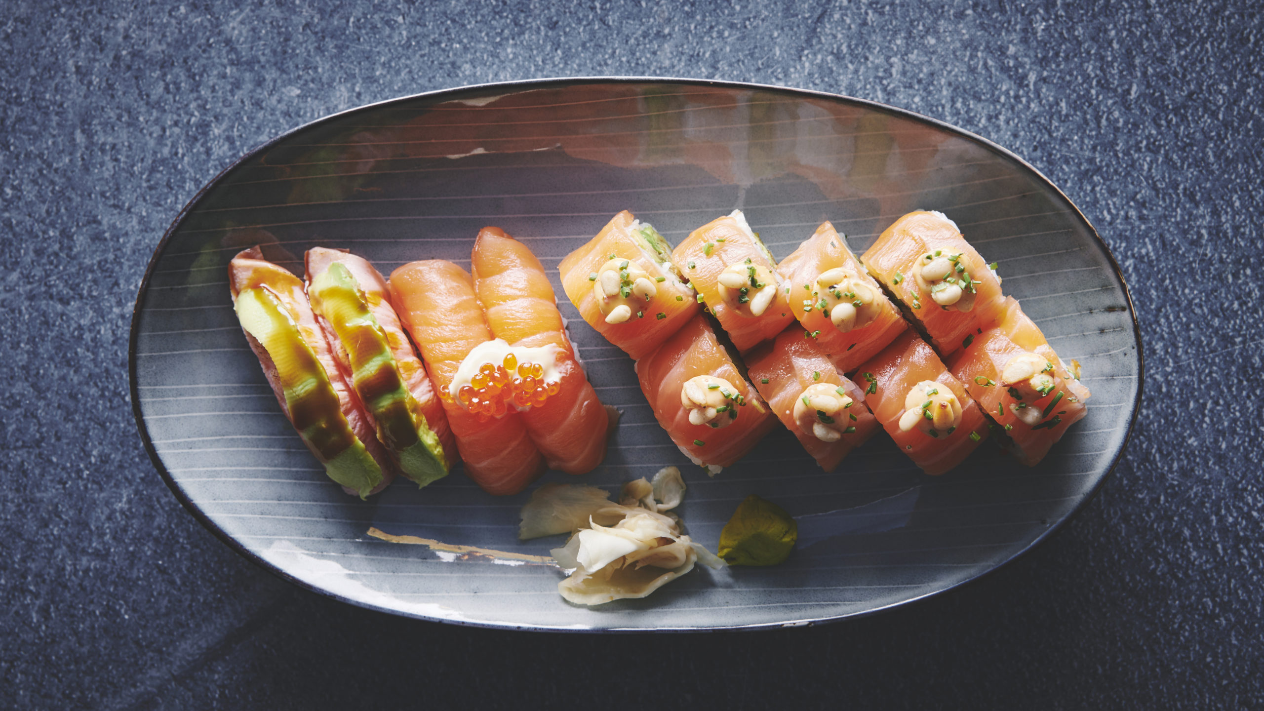 8 stk sparking salmon, 2 grillet laks nigiri, 2 laks nigiri